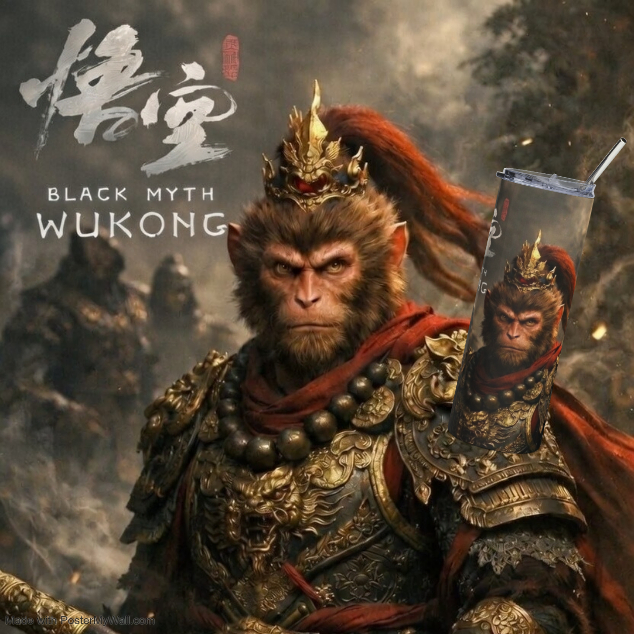 This 20 oz stainless steel tumbler carries a bold, mythic energy—wrapped in a full 360° print that features a fierce Wukong-inspired warrior portrait and dramatic, brushstroke-style typography. The tall, slim silhouette slips into cup holders and feels substantial in hand. It’s for morning commutes, late-night writing sessions, and long practice runs when you want your gear to reflect grit and story. The glossy protective coat preserves the artwork while the clear lid and reusable straw make sipping simple and spill-aware. Bring a piece of legend to everyday hydration—this tumbler pairs artwork-forward design with dependable stainless steel performance.